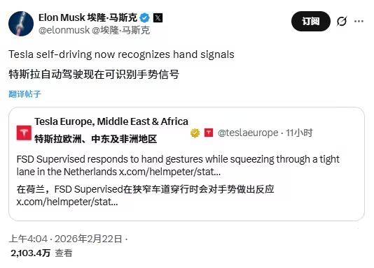 电动知家动静,2月22日,特斯拉CEO埃隆 · 马斯克正在小我社交账号暗示,“特斯拉从动驾驶系统现正在能够识别手势信号。”?。